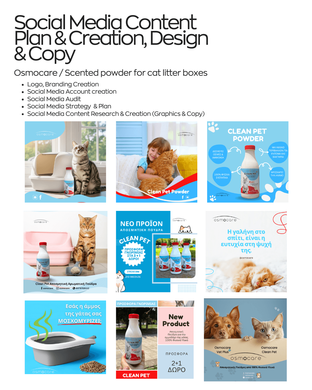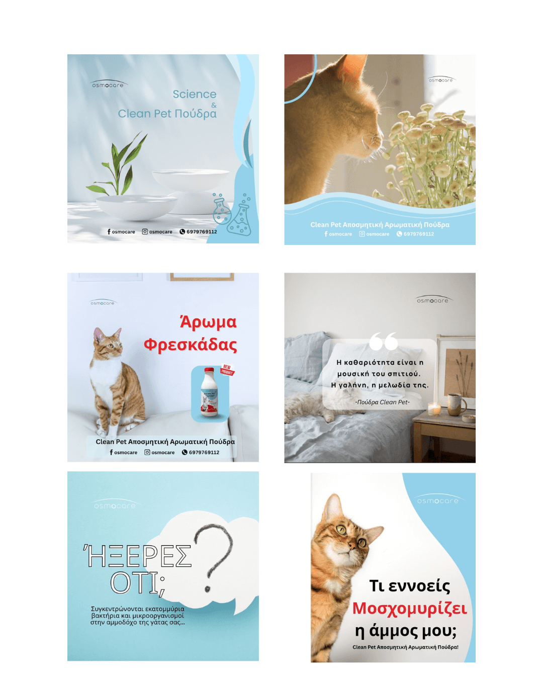 Primovia managed the strategy and content creation for Osmocare, a Greek company offering natural and scientifically designed products for pets and companion-animal spaces. The collaboration focused on two key products: Clean Pet, an aromatic powder for cat litter made with 100% natural Greek ingredients, and Vet Plus, designed for spaces with pets, which absorbs unpleasant odors and promotes a healthy and safe environment without chemicals.